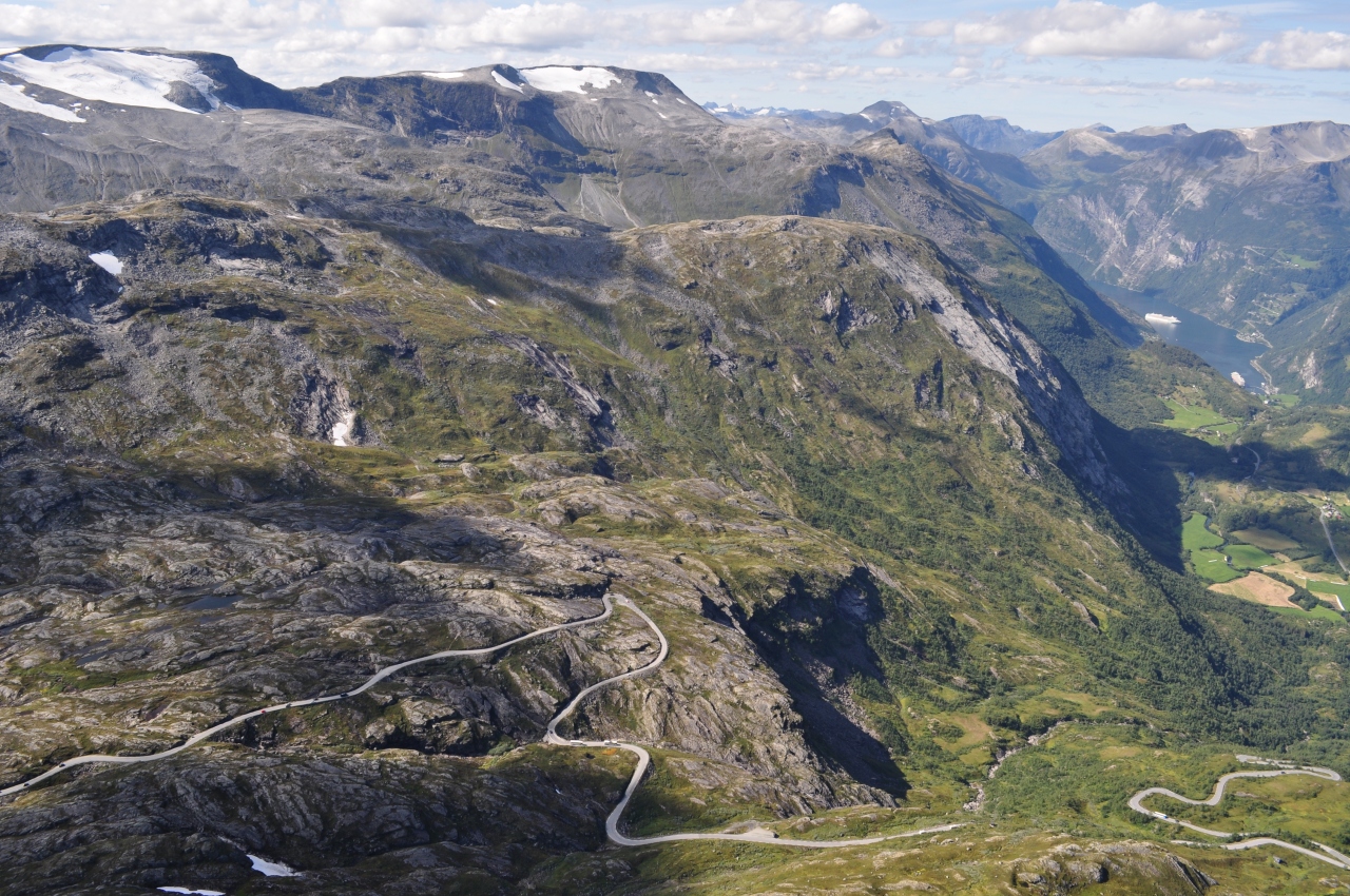 フィヨルドの雄大さがわかる絶景スポッットです。フェリーなど低い位置から見るフィヨルドも良いですが、ここは標高の高い場所なので全景が見えて、素晴らしい眺めです。8月でも日本の冬と同じ服装(フリースとダウンが)でないと寒いです。レンタカーで行きましたが途中は道がかなり狭い箇所があり、観光バスも走ってるので安全運転で行ってください。