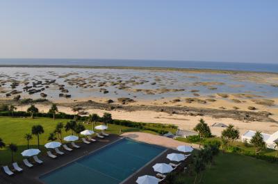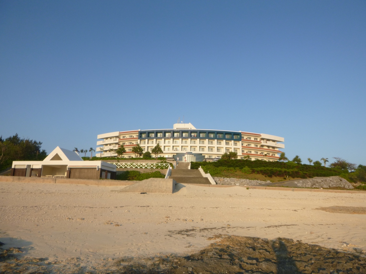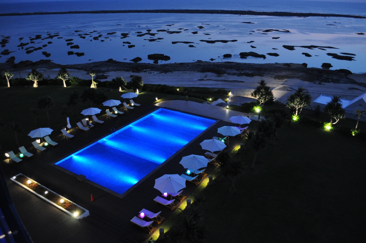 久米島空港の直ぐ近くにあります。ビーチ沿いにありますが、岩が多いので泳ぐという感じではありません。テラスからの眺めはとてもいいです。夕日と飛行機の離発着がいい感じにみえます。周辺にお店などはありませんので夜に出歩けませんが、落ち着いて滞在できます。芸能人もたまに宿泊しているみたいです。