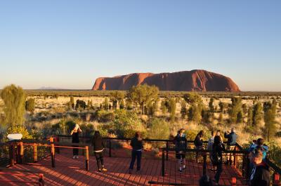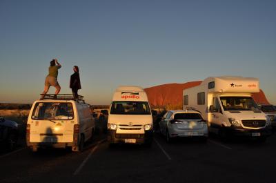 ウルルの夕日観賞のベストポイントです。昼間は冬でも酷暑で長くはいられませんが、夕日近くなると寒さ対策が必要です。駐車場は満車になるぐらい人が集まります。時間と共に表情を変えるウルルがとても神秘的な美しさです。まさしく聖地です。