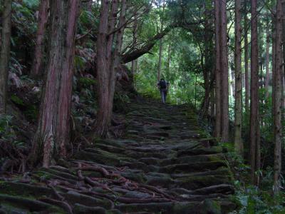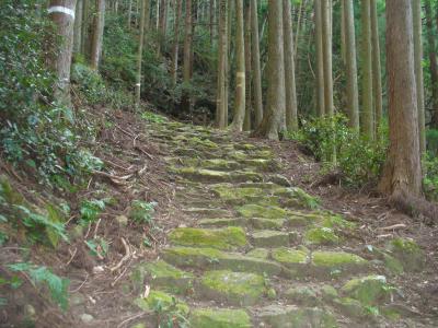 コース自体は緩やかなハイキングコースであるが逢神坂峠の前後は少し急、苔むした石畳道が風情を醸している中を歩く。