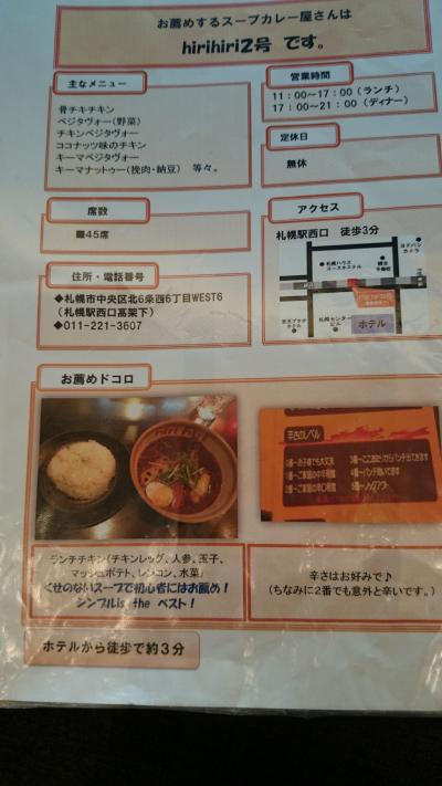 ロビーに スタッフによる スープカレーとラーメンのオススメ店をまとめたファイルがあり参考に食べあるきました。