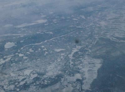 湿地地帯を河川が見事に蛇行して北へ流れている。水がある所は凍て付き白く...