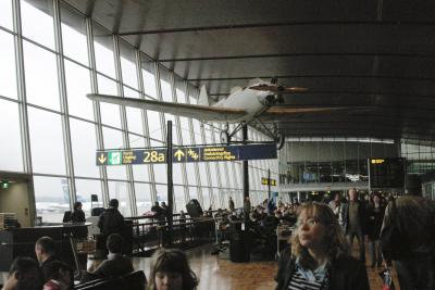 ヘルシンキ空港の出発ゲート待合ロビーには小型飛行機が吊り下げられていた...