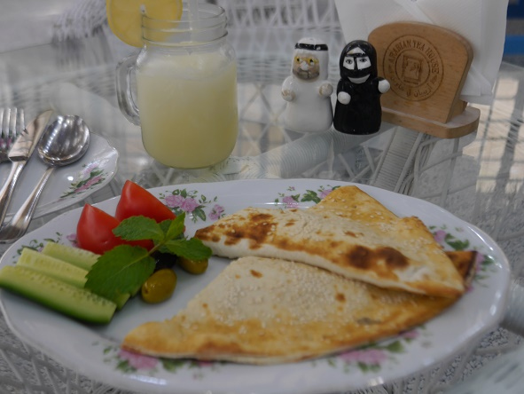 アラビアの伝統料理が食べられるんです♪ブルーとホワイトを基調にした乙女心をくすぐるメルヘンチックなスタイル。店内に入ると、驚いたのが床です。砂利?貝殻?が敷き詰められており、歩きながらジャリジャリと聞こえます(笑)オムレツなら食べれるかな?と思って「Balaleet with Omelet」をオーダーしたら「ひとりでは無理ですよ?」と仰るので、ちゃんと人を見てアドバイスしてくれるところは高評価。