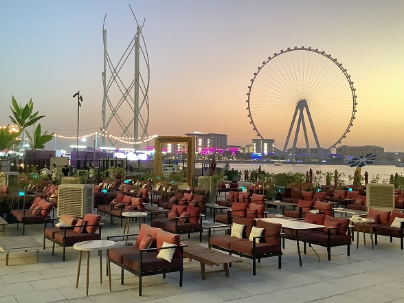 当日券を購入「The View At The Palm Tickets: 100AED」ミニチュアにみえる高級住宅地やレジデンスが規則正しく造られて。遠くにアイン・ドバイ、その手前に特徴的な形をした「アドレス ビーチ リゾート」積み木を組み立てたような「アトランティス ザ ロイヤル」