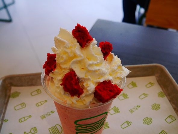 暑かったのでサイネージに表示されてるイチオシらしい「Red Velvet Shake」をオーダ。ベリー系のケーキがトッピングしてあり、クリームモリモリで美味しかったです。疲れたときは甘いもの、暑い時は冷たいもの、両方を備えたRed Velvet Shake。旨し