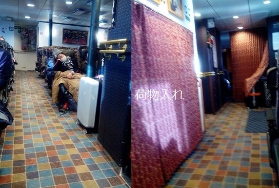 入口付近には(カーテンで目隠しのところ)荷物入れがあるので、ここは争奪戦になりますね~- 旅行時期