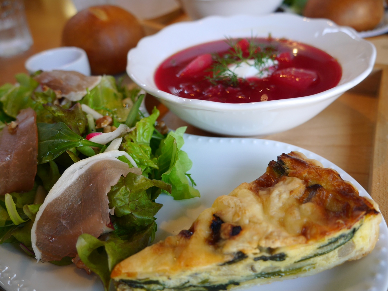 赤ビーツがたっぷり入ったシチューにサワークリームがアクセントになって美味しい