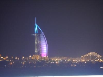 遠くに「ブルジュ アル アラブ」そして「ジュメイラ・ビーチ・ホテル」が見えてライトアップはキラキラ。- 旅行時期