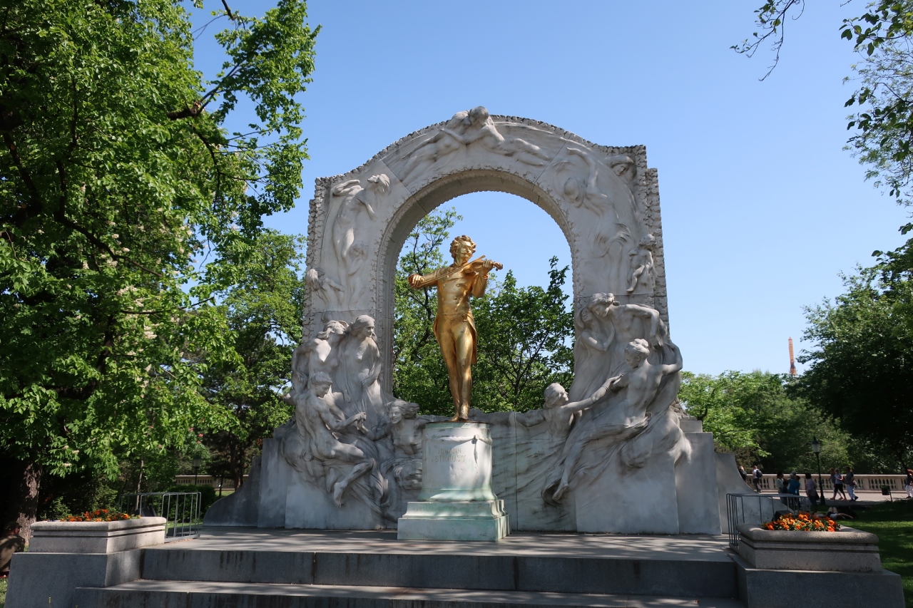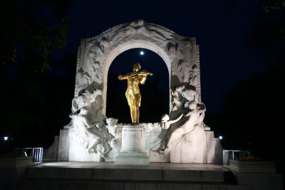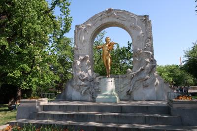 市立公園(Stadtpark)内に「ヨハン・シュトラウスの像」があります。ウィーンを代表する音楽家、またワルツの王と言われています。黄金のシュトラウスがとても輝いていました。明るい時間に見るときと暗い時間に見る時では、雰囲気が全く違うので、ぜひ、両方を見て欲しいです。また、団体客のツアーコースにもなっているようですので、いつも混雑していました。