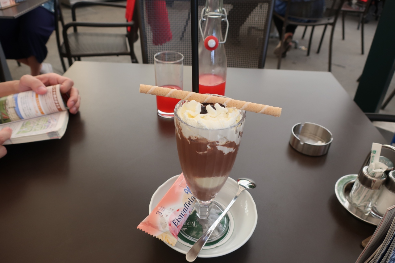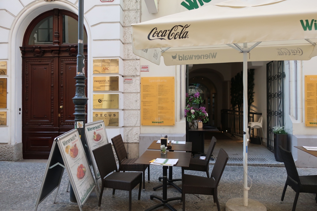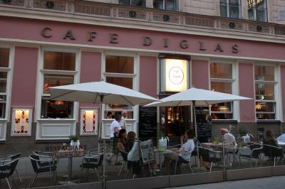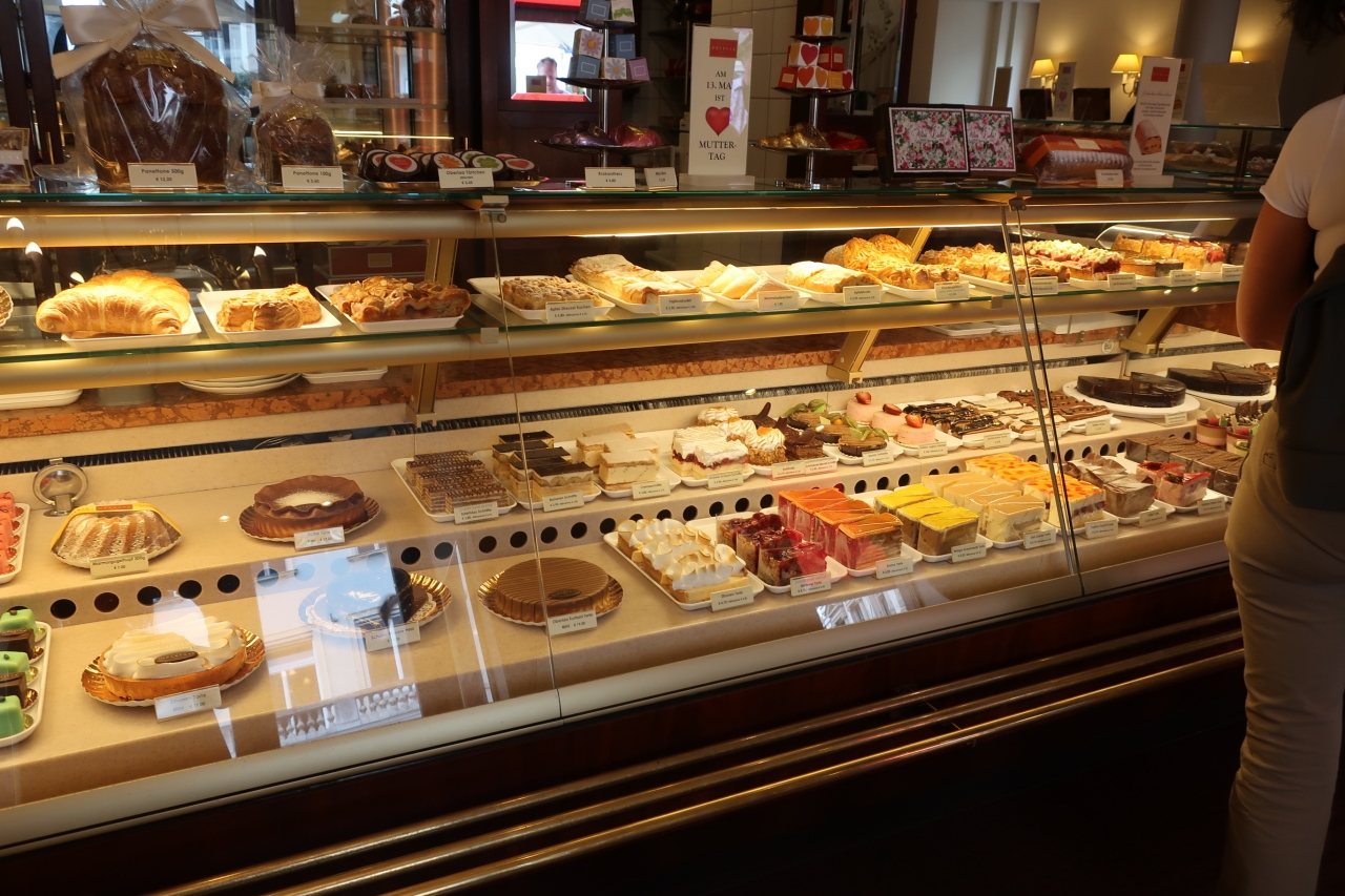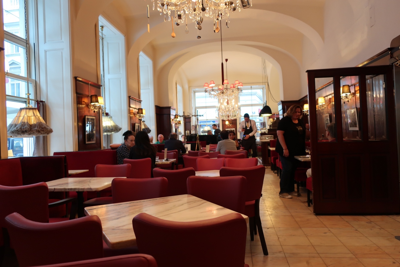 カフェで利用しました。シュテファン寺院そばにあるカフェです。カフェ内に入ると、落ち着いた色合いのインテリアで、格式ある雰囲気です。でも、シャンデリアをじーっと見ると、調理器具がぶら下がっていたりして、お茶目な雰囲気もあります。カフェメニューから、アインシュペナーをオーダー。こちらは、生クリーム少なめで、コーヒーの味がしっかり感じられます。会計は、クレジットカードは使えず、現金のみです。