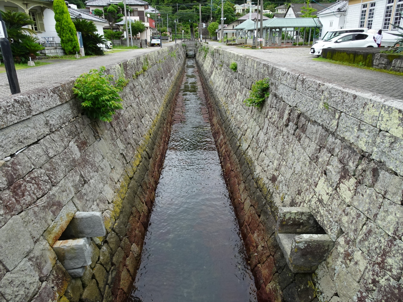 三角西港内で見つけた排水路。石積みの排水路です。明治20年、築港の際に造られました。こちらの排水路は山裾から海へ流れているようにみえます♪。頑丈な造りで、当時のまま残っており、とても歴史が感じられます。ぜひ、散策中に見つけて下さい。