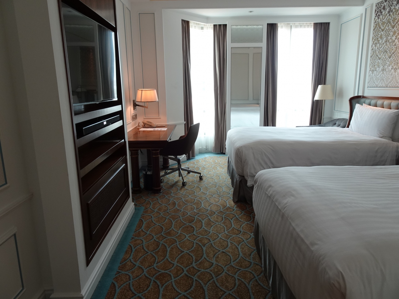 ホテルの最寄り駅はブギス駅で、ホテルまでは徒歩数分。ブギスジャンクション(ショッピングモール)と直結いていて、立地が最高です。ツインルームに2泊しました。3名で宿泊しましたが、ベッドはキング?クイーン?ベッドが2台だったので、エキストラベッドがなくても大丈夫でした。家族旅行なら、問題なしですね。バスルームは広く、シャワーブースがあり、利用しやすいです。眺望は、マリーナ側が見える部屋と、街が見える部屋があるようです。コロニアル調の雰囲気で素敵なホテルです!。スタッフの対応も素晴らしく、今度はゆっくり滞在したいと思いました。