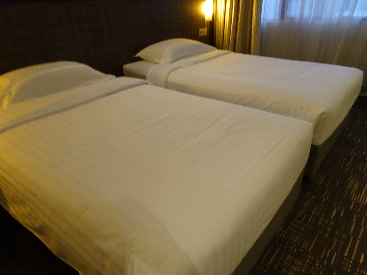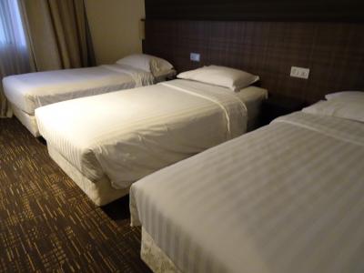 ブギス駅が近いということで、こちらのホテルに1泊しました。到着が夜だったため、寝るだけの予定での宿泊。3名の部屋と2名の部屋を用意していただきました。3名ルームは、ベッドが結構揺れて、小さめで、眠りにくかったのですが、2名ルームのベッドは大きめで寝心地良かったです。バスルームは、シンクの高さがとても高く、160㎝くらいの人だと使いにくいと思います。部屋によって違ったのですが、私が使用した部屋は、排水に問題が。なかなか流れてくれません(笑)。もう一部屋はなんの問題もなしでした。客室はシンプルです。エレベーターではカードキーをかざさないと部屋へは行けず、セキュリティはしっかりしています。Wi-Fiも問題なし。また、朝食が無料でついていました。しっかりした食事が朝からいただけました。ホテルスタッフの対応は早く、安心して宿泊できました。
