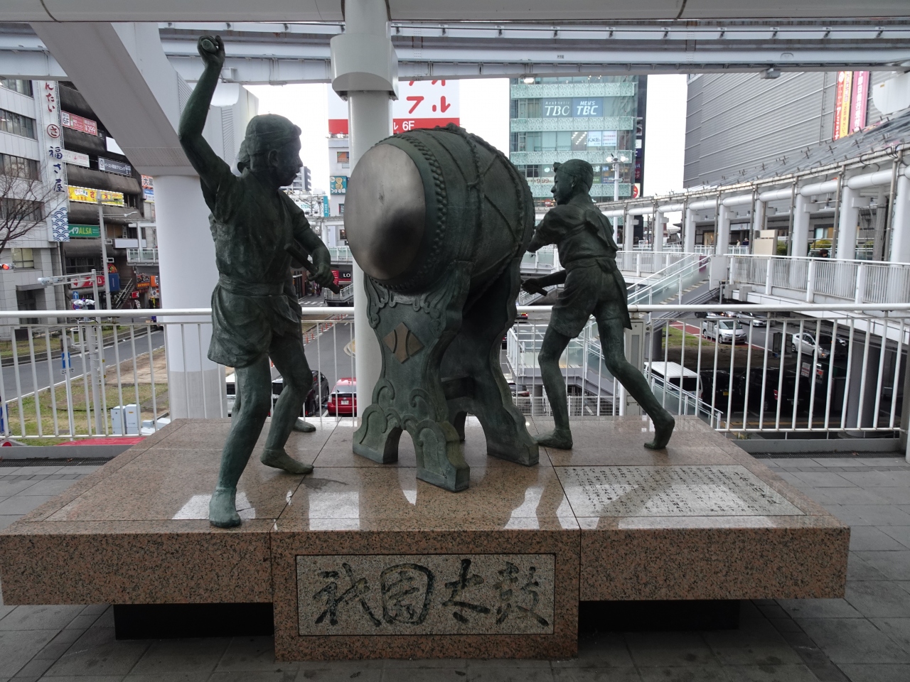 小倉駅のペデストリアンデッキに建っていました。ちょうど、ショッピングモールの「セントシティ」へ行く途中に見つけました。3人の子供が太鼓を叩く姿の像です。夏に行うお祭りの様子を表しているようですね。なんとなく、太鼓の音が聞こえてきそうと感じました♪。