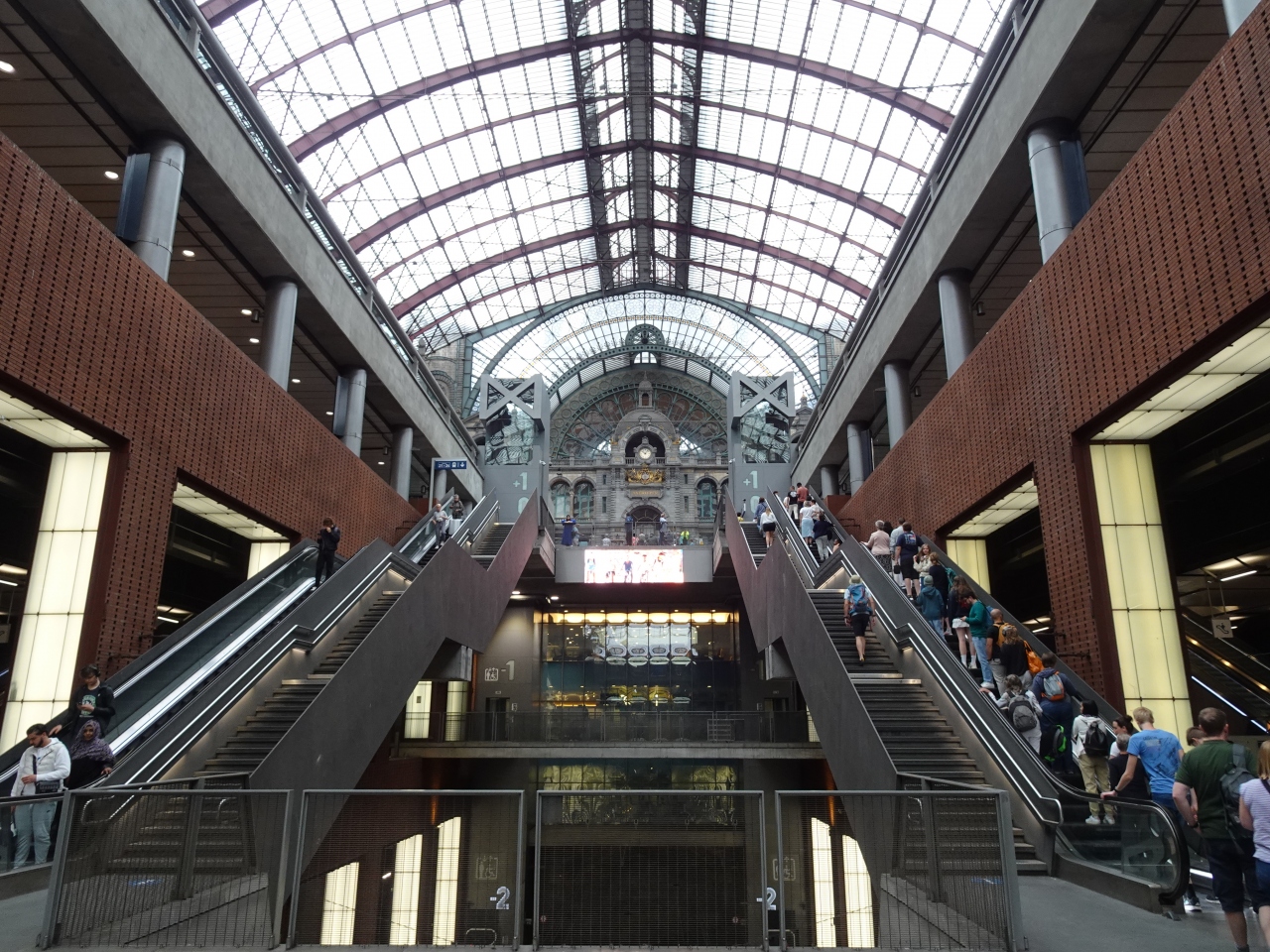 アントワープ中央駅はとても豪華で美しい駅でした。列車からホームに降り、エスカレーターで上っていくと、どんどんその美しさに圧倒されます!!。この駅だけでも観光の価値がありますよ♪。駅はとても大きく、ホームもたくさんあります。さすが、ベルギー第2の都市だけはありますね。構内には、カフェや観光案内所もあり、そちらも一緒に利用させてもらいました(笑)。アントワープへの旅のスタートが、こんなに素敵な駅からだなんて最高でした!!!。