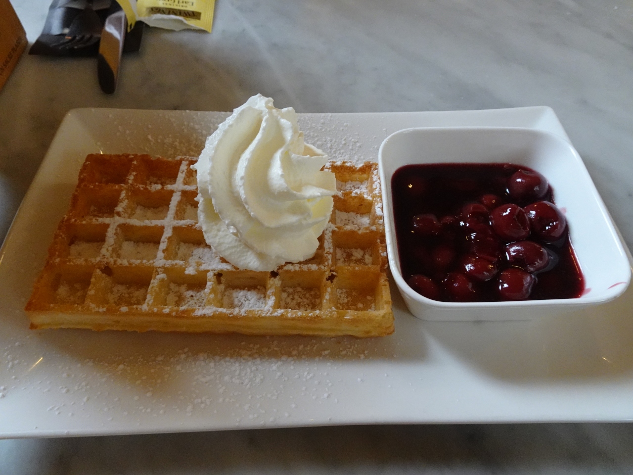 アントワープ中央駅の構内にあるカフェです。天井が高く、キラキラした雰囲気の店内でのカフェは、とても優雅な気分にさせてくれます。スイーツやサンドイッチなどがあり、カフェをしながらゆっくり過ごすことができます。店内にはトイレもあり、利用されるときは1ユーロと書かれていました。駅で利用しても1ユーロなので、これは仕方がありませんね。今回は、アップルタルトとワッフルをオーダー。ワッフルはチェリーソース付きで、酸味のあるソースで美味しくいただきました。アップルタルトは、がっつりとアップルが入っており、シナモンがきいていて、こちらも美味しいです。アントワープへ行かれた時は、ぜひこちらでカフェしてみて下さい♪