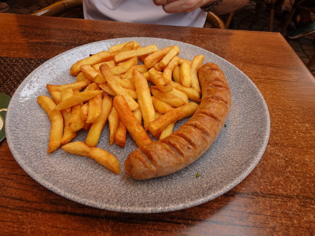 レーマー広場を観光中に見つけ、ランチで利用しました。ランチはテラス席のみでした。ドイツと言ったら、ソーセージというイメージなので、フランクフルトソーセージと焼いたソーセージを注文。また、アップルワインも注文しました。どちらのソーセージも、外はプリっとしていて、とても美味しいです。でも、私は焼いたソーセージの方が好みでした♪。付け合わせのザワークラウトやフライドポテトも美味しいですよ!。また、アップルワインは、酸味のあるさっぱりしたお酒で、グビグビ飲んでしまいます(笑)。レーマー広場でドイツの昔ながらの可愛らしい建物を眺めながらの食事は、より気分が上がりました!!。