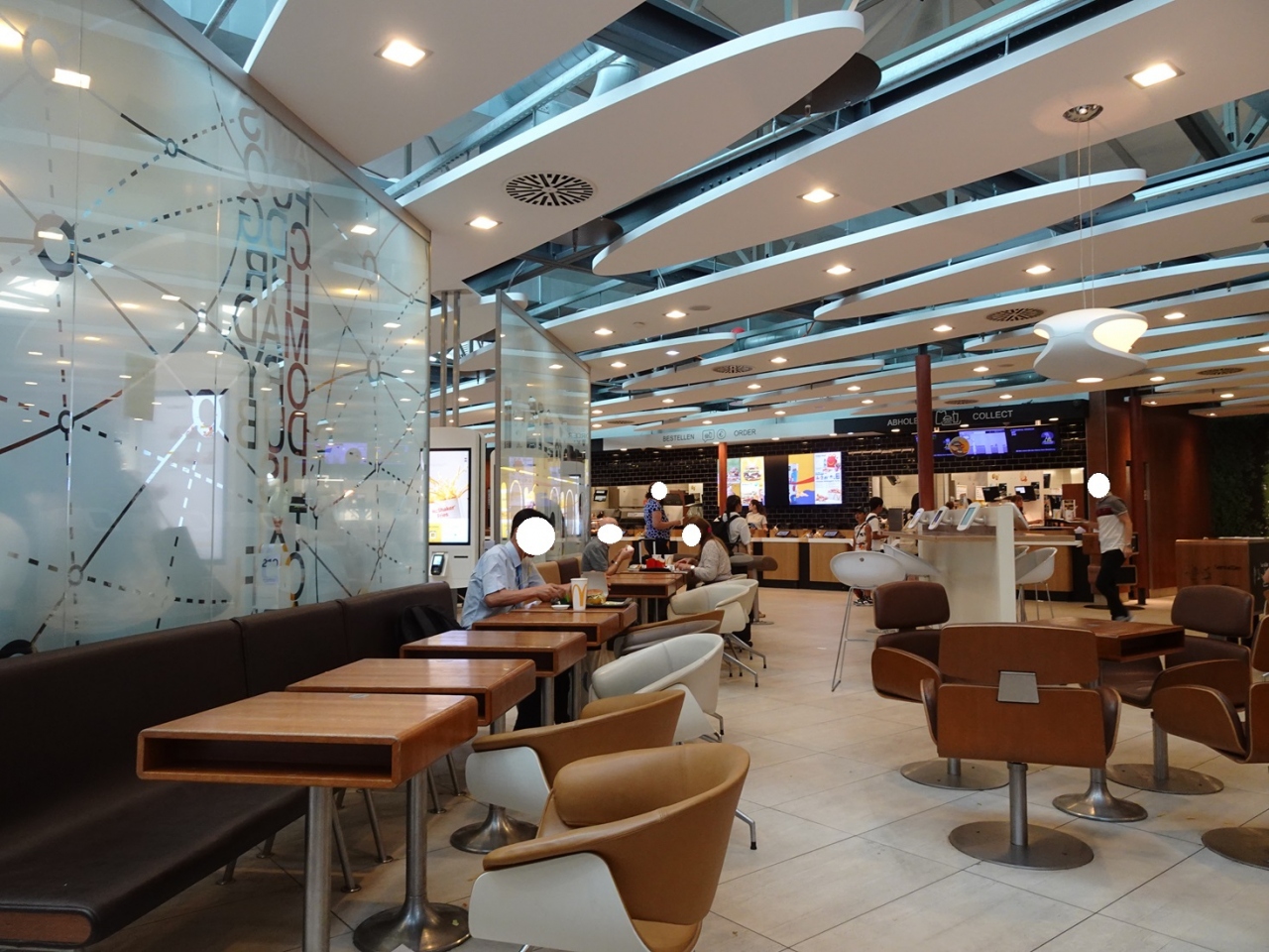 フランクフルト国際空港ターミナル2で利用しました。チェックインカウンターのオープンを待つために、どこか休めるところは?!と探すと、マクドナルドがありました。ターミナル2はマクドナルドが入ったフードプラザしかカフェできるところがないように感じました。なので、みなさんこちらへ流れてきます(笑)。テーブルや椅子がたくさんあり、ゆっくり寛げます。オーダーは、タッチパネルで行います。ドイツ語と英語でオーダーでき、キャッシュかクレジットカードでの支払いも選べます。バニラシェイクを飲みましたが、これがとても大きい!!!。日本では考えられない量でした。。。でも、美味しくいただきましたよ!!。