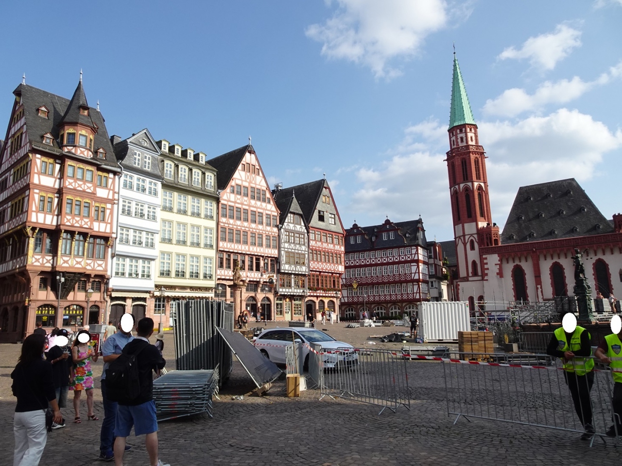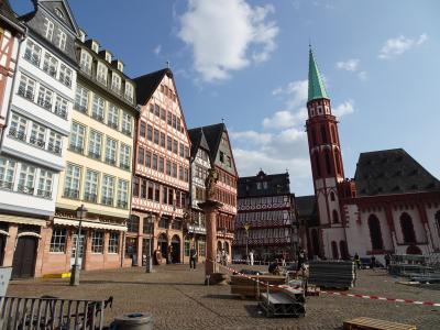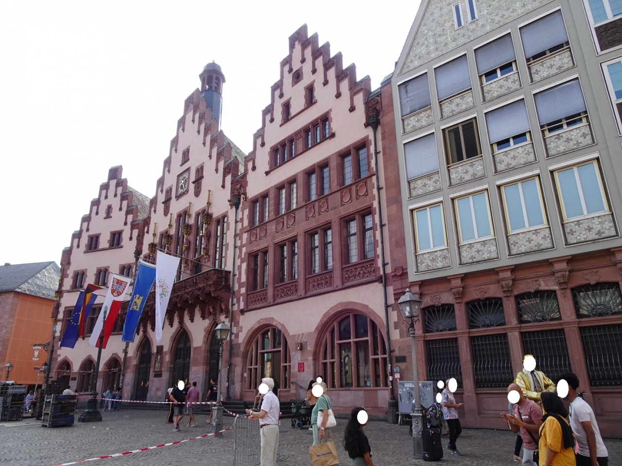 フランクフルトでおすすめの場所と言ったら、レーマー広場。ホテルスタッフの方にも、レーマー広場(旧市街)を一番にすすめられました(笑)。高層ビルなど現代的な建物が多いフランクフルトの街に、いきなり可愛らしい昔の建物が!!。階段状になった屋根(切妻屋根)が特徴的でした♪。訪れた時は、工事中?かイベント準備中?なのか、中央は立ち入りができませんでしたが、レトロで可愛らしい雰囲気は感じられました。また、周りはレストランやお土産ショップなどがありました。