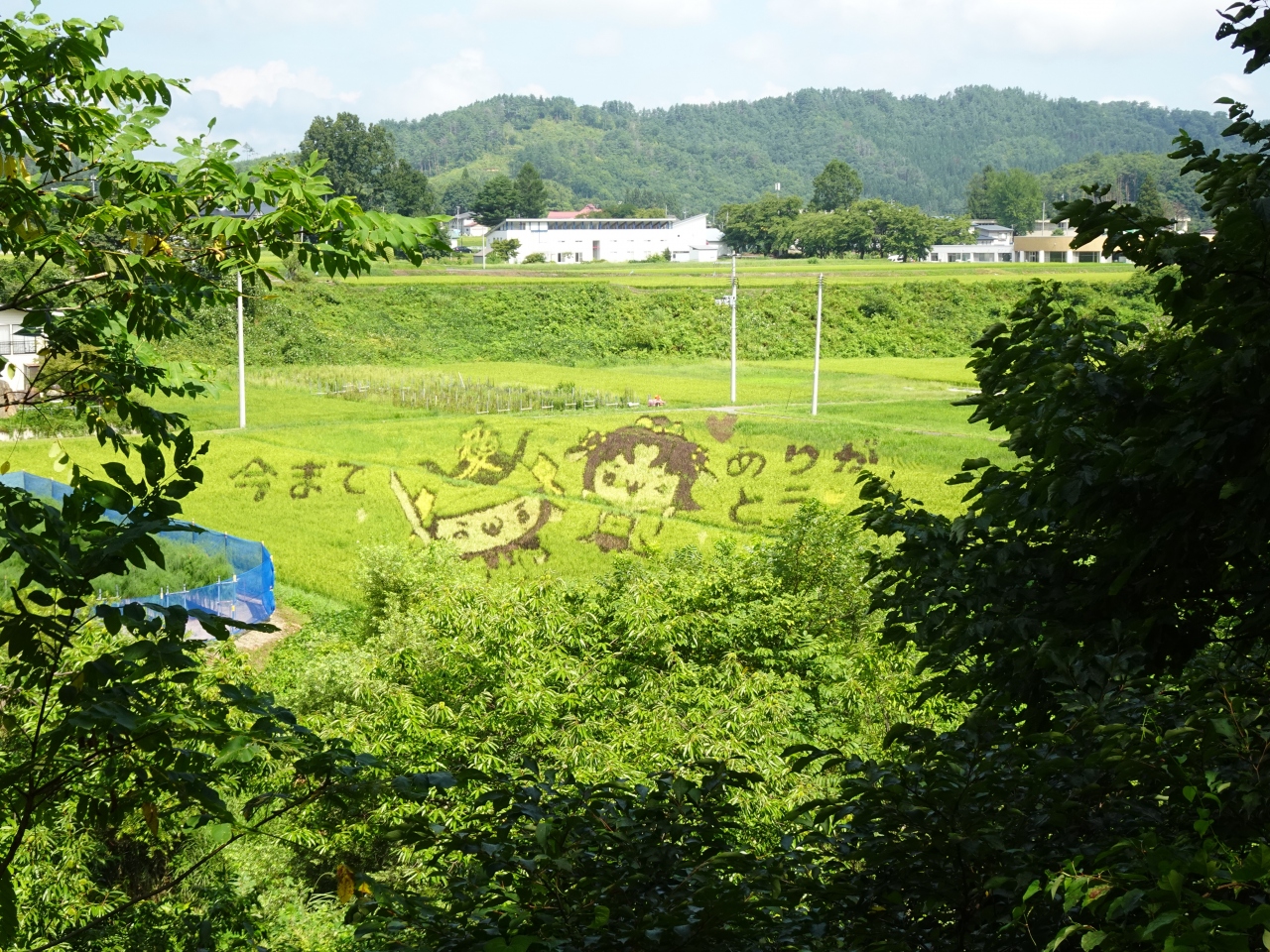 小野川温泉に宿泊した際に立ち寄りました。宿泊した河鹿荘からすぐの所に、「小野川温泉田んぼアート」がありました。無料の駐車場があります。「田んぼアート」の生育の経過や製作工程など、パネルでしっかり紹介されていました。第17回目は直江兼続のマスコットキャラクター「かねたん」と直江兼続の妻「お船の方」をイメージしたマスコットキャラクターです。愛らしいキャラクターでほんわか気分になれました。