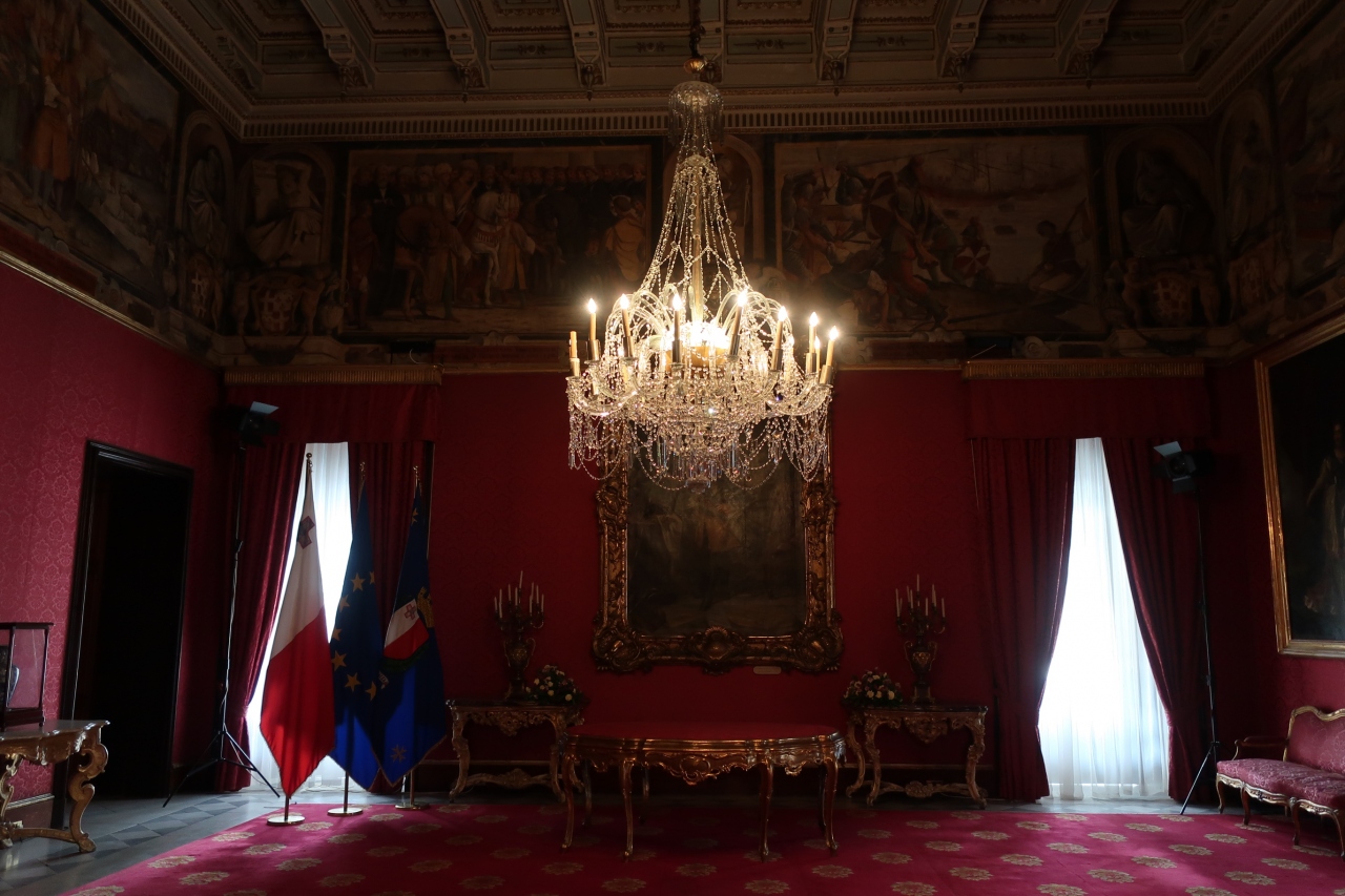 マルタへ行ったなら、ぜひおすすめしたい騎士団長の宮殿。入場料は10ユーロ。オーディオガイドもありますが、日本語は対応していません。内部は、「赤の間」で赤いタペストリーが壁一面に飾られている部屋や、ネプチューンの中庭、天井の豪華なフレスコ画、床は大理石、そして、兵器庫と見どころたっぷり。特に、兵器庫では、甲冑、武具、馬車など約6000点も展示されています。おすすめです!。