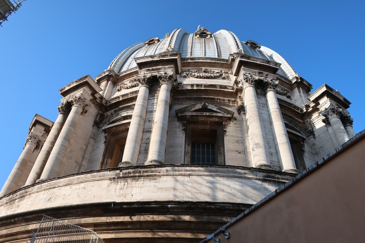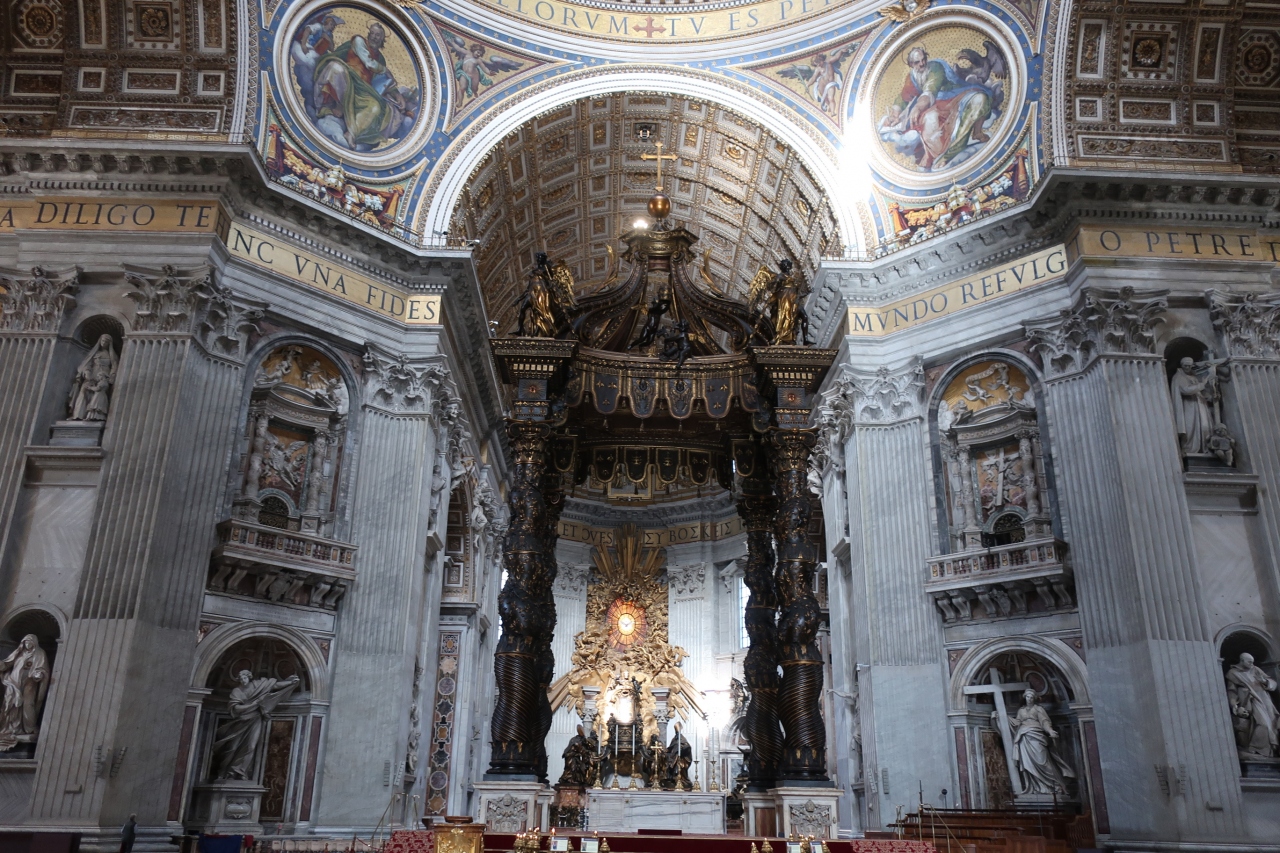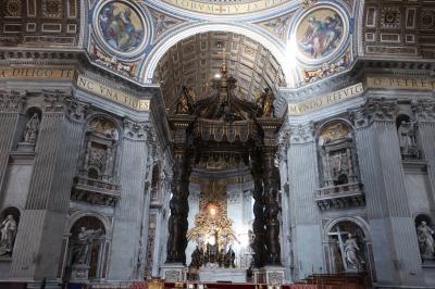 朝、7時半にサン・ピエトロ大聖堂へ。その時点で30分程並んでセキュリティチェックを受けました。8時にクーポラのチケットをゲットし、クーポラを見学後、直接エレベーターでサン・ピエトロ大聖堂の内部へ。すべて見学後、外へ出ると、入場待ちの長蛇の列が。なので、朝早く見ることをおすすめします。こちらの大聖堂は、カトリック教会の総本山。内部は、非常に荘厳な雰囲気です。ベルニーニのブロンズ天蓋、そこから見上げるクーポラ。どこを見ても素晴らしい。見どころがたっぷりです。