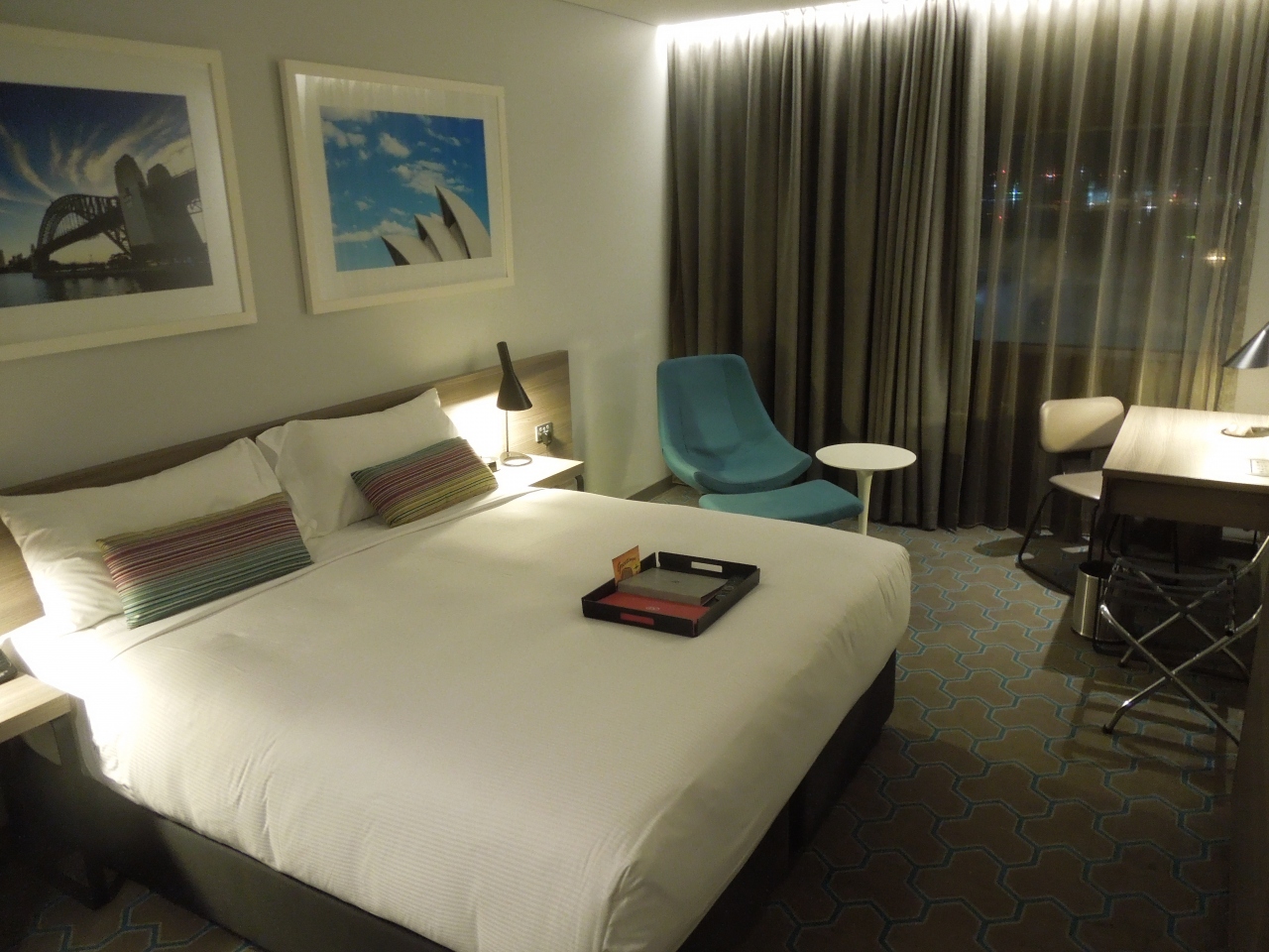 シドニー国際空港すぐそばのホテルです。翌日のフライトが早朝だったため、前日に宿泊しました。客室は一番下のカテゴリー。でも、十分広く、大きめのスーツケース2つを全開にしても、全く問題なし。今回宿泊した部屋が、たまたまエアコンが壊れていたのかわかりませんが、オフにすることができず、非常に寒い思いをしました。8月のシドニーはまだ寒いので、せめてオフれるか、暖房になるとうれしかったです。トイレは個室、バスルームはシャワーのみ。部屋からは、空港が見えました。なので、待機中の飛行機の音などが、聞こえてきます。翌日、国際線で早くに出発の時に便利なホテルです。