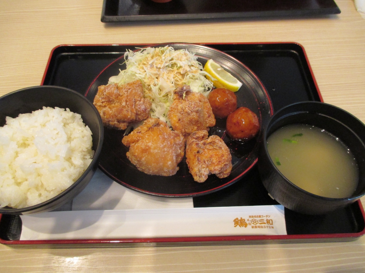 三井アウトレットパーク木更津店内のフードコートにありました。鶏料理で有名なお店です。親子丼、から揚げなどさまざまなメニューがあります。今回は、鶏唐揚御膳をチョイス。税抜き880円はお得です。から揚げ2種類で各2個、肉団子2個とボリュームたっぷり。とても満足できました。