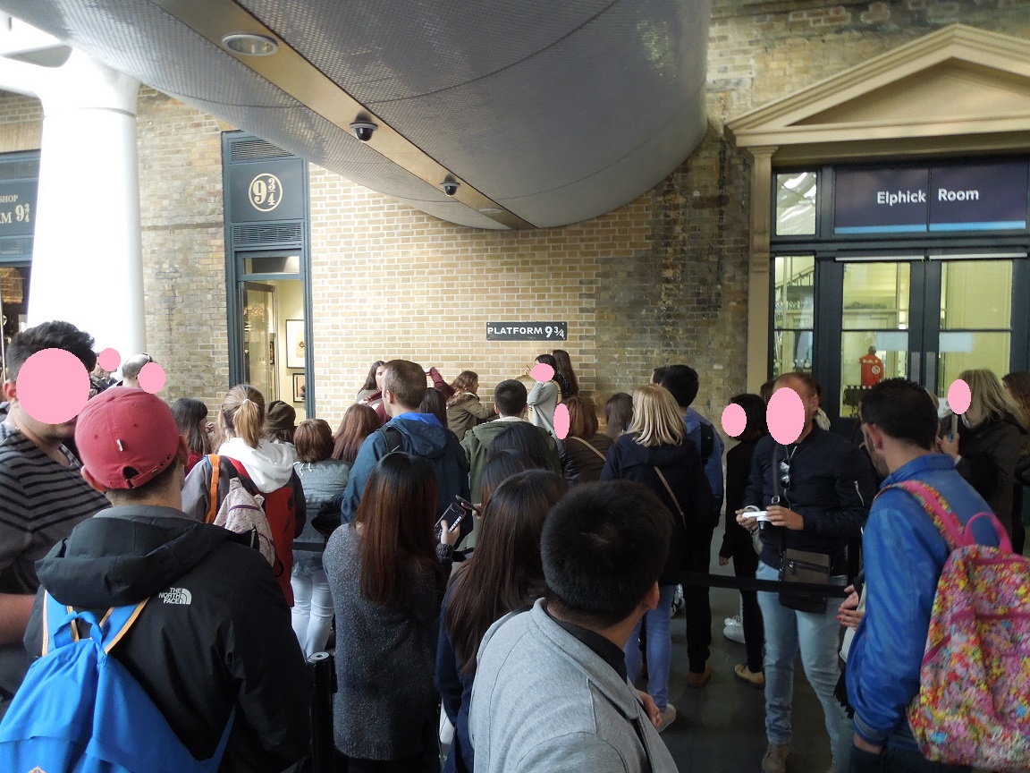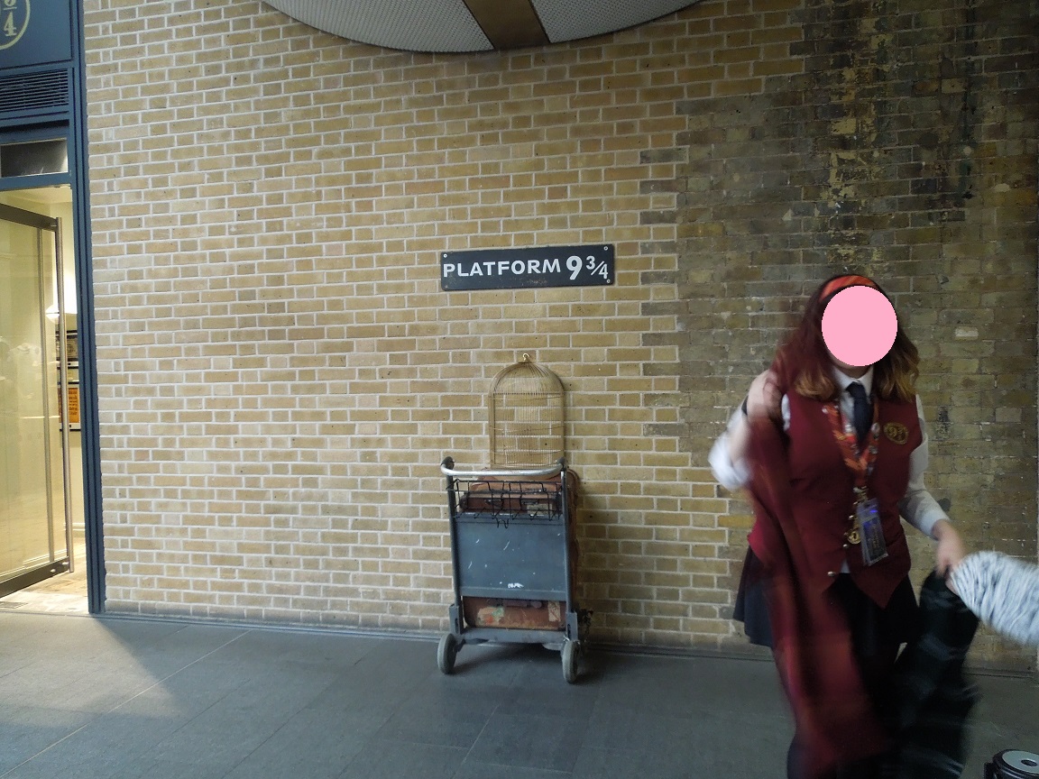キングスクロス駅内に、「PLATFORM 93/4」があります。夕方に訪れましたが、長蛇の列ができていました。30分以上は待ちます。でも、せっかくなので並びました。スタッフがマフラーを用意してくれています。好きなマフラーを選んで、杖を持ち、ポーズを決めます。2ポーズ撮らせてもらえます。自分のカメラでも撮影できますが、ジャンプ写真はうまく撮れませんでした。なので、スタッフが撮ってくれた写真を、すぐ横にあるスーベニアショップで購入。良い記念になりました。