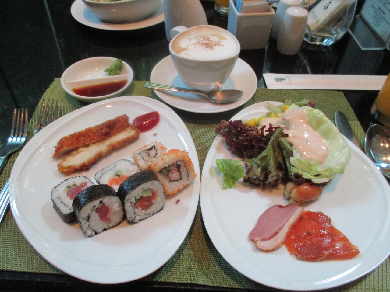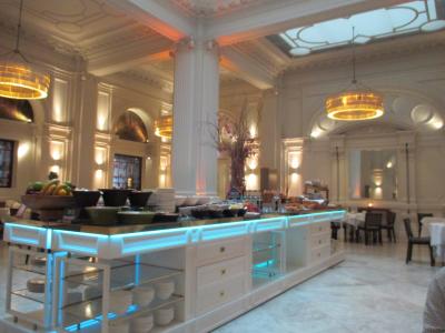朝食で利用しました。メニューは、ビュッフェとスペシャルメニューがあります。ビュッフェは、イングリッシュブレックファストで、種類豊富で楽しめます。ポークソーセージはボリュームたっぷり。スペシャルメニューは卵料理、パンケーキ、ワッフル、フレンチトーストなど。どれも、ボリュームったっぷりなので、最初にハーフサイズでお願いしました。ワッフルは外はパリっと、中はしっとりで最高です!。スタッフの対応も素晴らしく、快適に朝食をいただくことができました。レストラン内は、インテリアは白が基調で、天井が高く、ラグジュアリー感が満載。天井にあるステンドグラスも素敵です。朝から、ゴージャスな気分になれました。