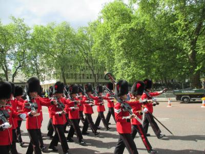 バッキンガム宮殿の衛兵交替式を見学しました。しっかり見たい人は、早めに行って場所を確保しないと、すごい混雑で見学も大変です。楽隊パレード、衛兵パレード、騎馬隊など見どころはたくさん。ちなみに、一番人気の場所は、「ヴィクトリア女王記念碑」のまわりのようでした。