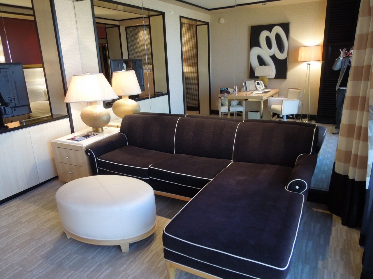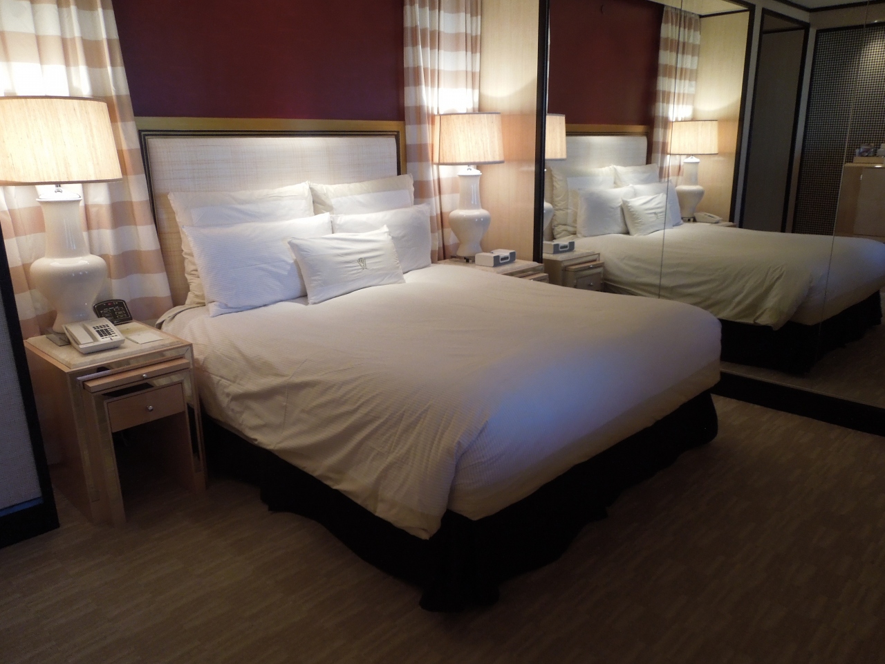 パノラミックスイートに宿泊。お部屋に入ってすぐに目に入るのは、壁一面がすべて窓ガラス。光が入ってきて非常に部屋を明るくしてくれます。サイドの壁も一面ミラーになっているのでより広く感じられます。リビングとベッドルームはテレビが設置している収納ケースで仕切られています。テレビは360°回転するので、リビング、ベッドルームどちらからも見ることができます。バスルームは非常に広く、ダブルシンクです。シャワールーム、トイレはセパレートされてます。ただ、トイレは背の低い人にはきつく、しっかり座ると足が付かなくなってしまうほどです。バスルームにもテレビがありました。セーフティボックスは、幅が狭く、大きめのPCは入らなかったです。