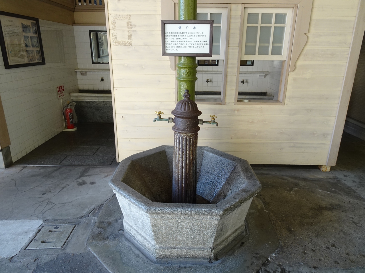 門司港駅構内にありました。丁度、トイレの前です。駅が開設された頃(1914年)に設置され、それ以来、旅行者に門司の「おいしい水」を供給しています。歴史ある水飲み場です!。終戦後、多くの人が引き揚げてきた人たちが、門司に上陸し、安堵の思いで喉を潤したことから、「帰り水」と呼ばれるようになったそうです。今も使用できるようですよ!。見つけてみて下さいね。