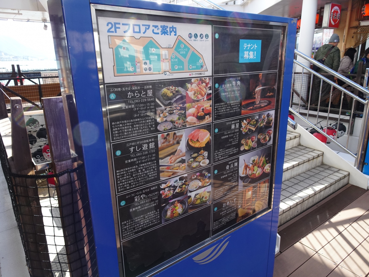 唐戸市場で毎週末と祝日に開催されています。下関の魚介類が味わえるイベントです。訪れた時は日曜日。お寿司コーナーでは、長蛇の列ができており、長時間待つ覚悟が必要です(笑)。お寿司、海鮮丼、ふぐ汁など、魅力的な下関グルメが盛り沢山。時間に余裕を持って伺うことをおすすめします。