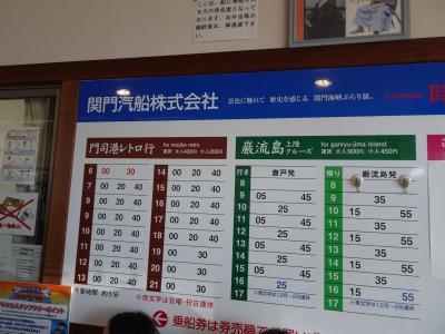 下関ー門司港や下関ー巌流島などへ運航しています。旅行中、何度か利用しましたが、下関ー門司港は所要時間が約5分ととても短く、観光するのにとても便利でした。下関ー門司港は片道400円。20分毎に運航しています。下関ー巌流島(上陸クルーズ)は900円です。結構スピードがでるので、揺れます!。乗っている時より、乗船して待っている間の方が揺れは激しいかも(笑)!?。関門海峡の素晴らしい眺めが見られますよ!。
