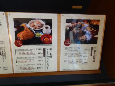 永平寺へ向かう途中にありました。ランチで利用。ランチタイムだったため、混雑していました。こちらでは、福井名物がいただけます。「おろしそば」や「ソースかつ丼」などがあります。「福井名物おろしそばセット(永平寺名物胡麻豆腐付)」と「ソースかつ丼」を注文。2種類のそばが提供されましたが、違いはわかりませんでした(笑)。大根おろしはめちゃくちゃ辛く、でも、美味しくいただきました♪。「ソースかつ丼」はさっぱりとしたソースがかかっています。比較的大きめの駐車場があるので、永平寺へ行かれた時におすすめです。
