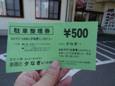 東尋坊へ行く際、夕なぎ荘の駐車場を利用しました。駐車料金は500円ですが、店内で買い物や食事2000円以上すると、後で500円返却してくれます。店内では、海鮮料理などがいただけます。また、お土産商品もたくさんありました。大型バスの停留所もこちらのお店の前で、とても便利なところにあります。