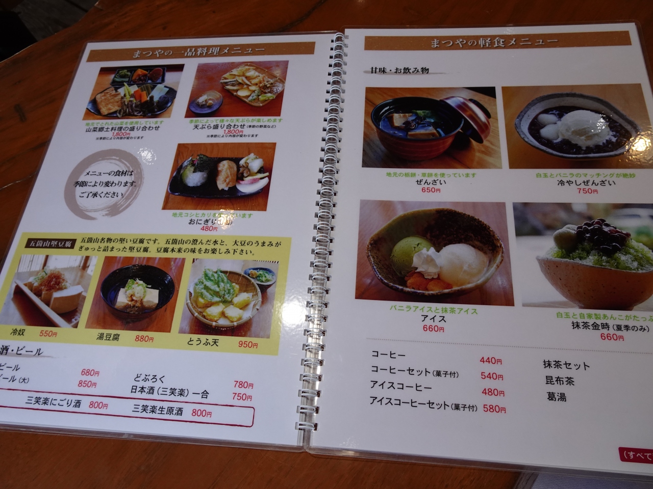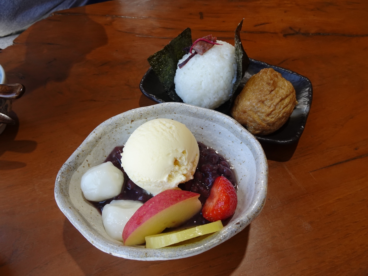 五箇山の相倉集落にある茶店まつや。食事処であり、お土産ショップでもあります。休憩に利用させていただきました。イートインスペースは結構ありますが、スタッフが少なく、提供までに時間がかかりました。フードメニューはお蕎麦がメインで、他に軽食・甘味メニューがあり、ぜんざいなど人気のようです。今回は、おにぎり(2個)と冷やしぜんざいをいただきました。おにぎりは、地元こしひかりを使用していますよ!。冷やしぜんざいもとても美味しくいただきました♪。ゆったりとした雰囲気の中、のんびり過ごせました!。