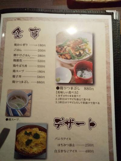 夜遅い時間に利用しました。JR両毛線の前橋駅近くにある鶏料理の居酒屋です。焼き鳥がメインだとは思いましたが、時間も遅かったので、定食をいただきました。親子丼と鶏ひつまぶしをいただきました。親子丼は、少しお肉が少ないように感じました。ひつまぶしの方は、出汁でいただけたりできるので、さっぱりと食べられます。平日の夜だったので、店内は空いていて、カウンター席でしたがゆっくり食事をすることができました。次回、訪れる機会があれば、種類豊富のつくね料理をいただきたいです。