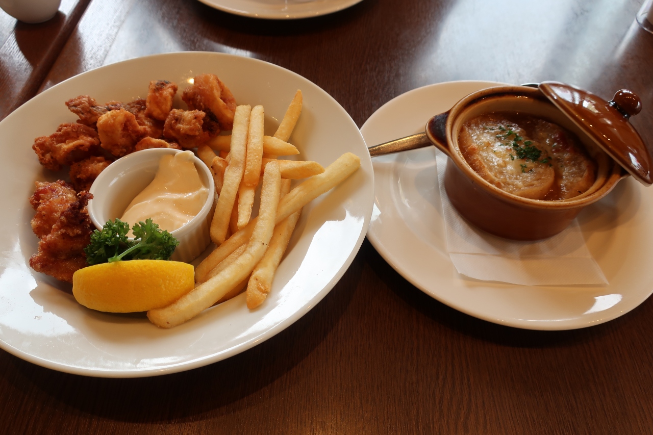 湯河原へ行く途中に利用しました。小田原あたりで、駐車場があるレストランを探していましたが、あまりなくこちらへ。国道1号沿いで、駐車場が大きいです。軽くいただきたかったので、オニオングラタンスープとフライセットを。デザートにクリームあんみつをいただきました。オニオングラタンスープは、定番で安心の味。熱々でおいしくいただきました。