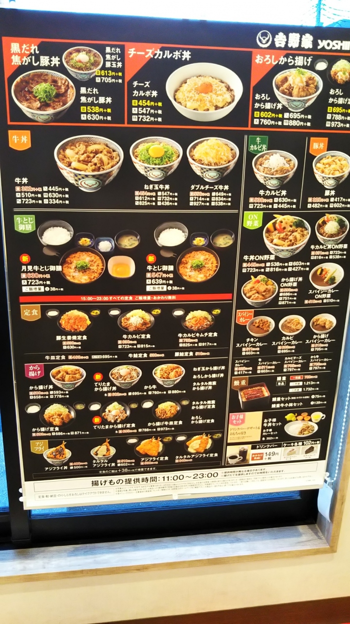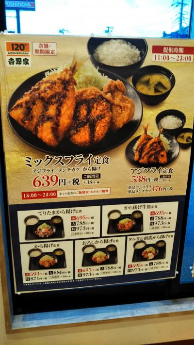 環状2号線(略称環2)の下永谷にある吉野家です。吉野家と言っても、普通の吉野家じゃなく、外観が黒く、メニューも違います。もちろん定番メニューはありますが、フライ系、唐揚げなど種類が豊富。ドリンクバーやデザートメニューもありました。家族連れ、女性もゆっくりできるように、テーブル席が多いです。今回は、アジフライ丼を頂きましたが、衣はサクッと身はふっくらで美味しかったです。また、相方は唐揚げ定食でしたが、唐揚げがとても生姜が効いていてさっぱり食べられました。また、機会があれば利用したいです。