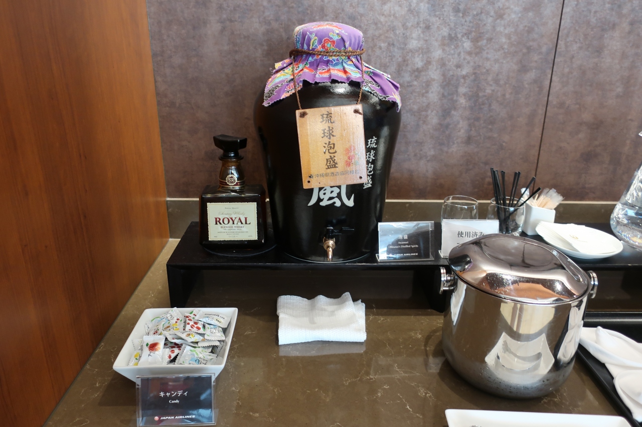 那覇空港内にあるJALの国内ラウンジです。ラウンジ内は非常に混雑していました。席を見つけるのも大変でした。それほど大きくはないラウンジのように感じます。さすが沖縄だなぁ~と感じたのは、アルコールドリンクで泡盛を見た時でした。