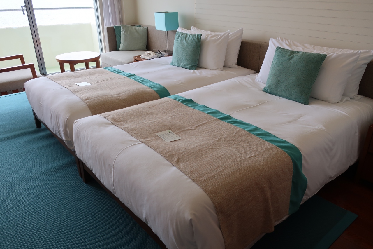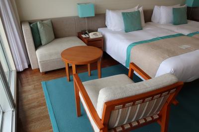 沖縄旅行時に宿泊しました。クラブフロアを予約。ホテルに到着時に名前を聞かれ、そのままクラブラウンジへスタッフと一緒に行き、チェックインはラウンジで行いました。スタッフの対応が素晴らしく、いつも笑顔でテキパキと対応してくれました。客室は、オーシャンビューでした。ツインベッドで、寝心地は良いです。広さは2名での宿泊なら十分の広さ。部屋のカラーが白とブルーの組み合わせで、リゾート感が満載!。バスルームは、少し古さを感じましたが、気になるほどではありませんでした。とても快適に過ごせたので、沖縄へ行ったときは、またリピートしちゃうと思います。