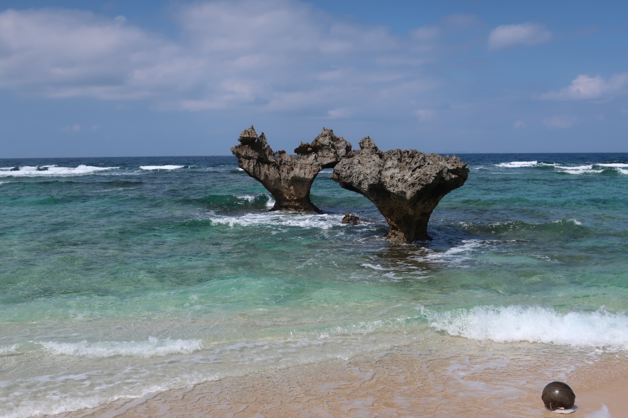 嵐のCMで有名なハートロック。ティーヌ浜にあります。私は、ティーヌ浜がどこにあるのか調べずに行きましたが、島を周っている時に案内があるので、すぐに見つけることができました。そばには駐車場がありますが、各駐車場で料金が違ったりします。また、ハートロックを見るまでには、足元の悪い道を通らなければいけないので、注意が必要です。波の浸食でハート型になった岩。キレイな海とハートロックが見事です!。