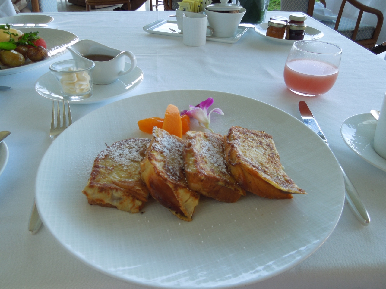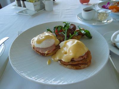 朝食に行きました。予約をしていましたがテラスの最前列の席は取れなくて残念。2列目の席に通されましたが、ダイヤモンドヘッドが見え満足でした。鉄板メニューのフレンチトーストとエッグベネディクトを注文。どちらも裏切らない味でシェアして食べました。値段は高めですが、サービス、景色を含めると納得できます。