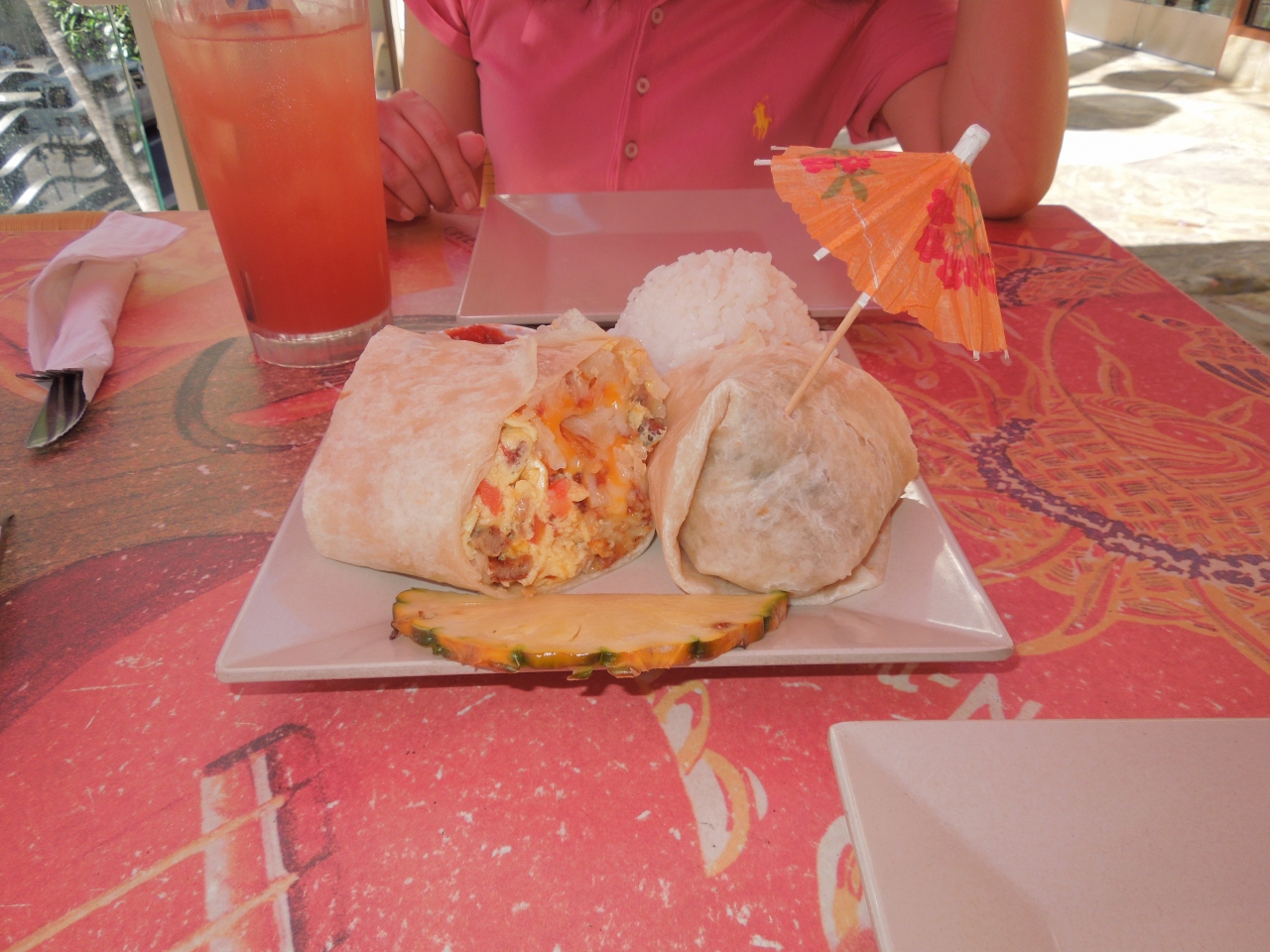 ビーチウォーク2階にあるレストラン。ハンバーガーがメインのレストランだとは思いますが、朝食に行ったので、ハンバーガーではないメニューをチョイス。エッグなどをピタパンで巻いた料理をオーダー。大きすぎて、お口に入りづらかった・・・。2人でシェアで十分です。ライスもついていて美味しかったです。スタッフも笑顔で接してくれました。気分よく食事ができます。