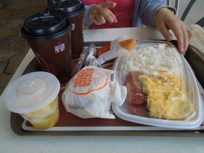 現地のタクシーの運転手から聞いたスパムと卵とご飯セットをオーダー。おすすめと言っていたので楽しみにしていましたが、卵が苦手な感じに仕上がっていました。スパム、ソーセージは美味しかったです。ビスケットサンドも日本になくオーダー。フルーツ、ハッシュポテト、コーヒーセットで中々のお値段になっちゃいます。テラス席からはワイキキビーチがいい感じに見えて結構気に入りました。