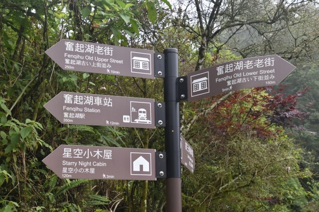 奮起湖駅の場合、老街があって、そこには土産物屋、食べ物屋などが多くあり、阿里山に向かってバスに乗る場合も、十字路駅で乗るよりバスの座席に余裕もある。阿里山森林鉄道で最大の駅で、列車のメインテナンスをする車庫も敷地内にあった。