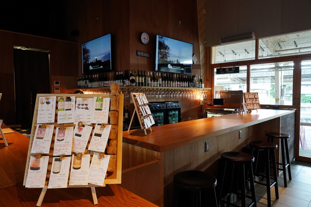 2023年6月に開業したワインバーです。小諸駅舎内にあり、ホームからも入店することが出来、列車待ちでも気軽に立ち寄ることが出来ます。小諸市内にあるワイナリーのワインが揃えてあり、グラスでも十数種類飲むことが出来ます。ワインに合う料理もあり、ワインと一緒に楽しめます。